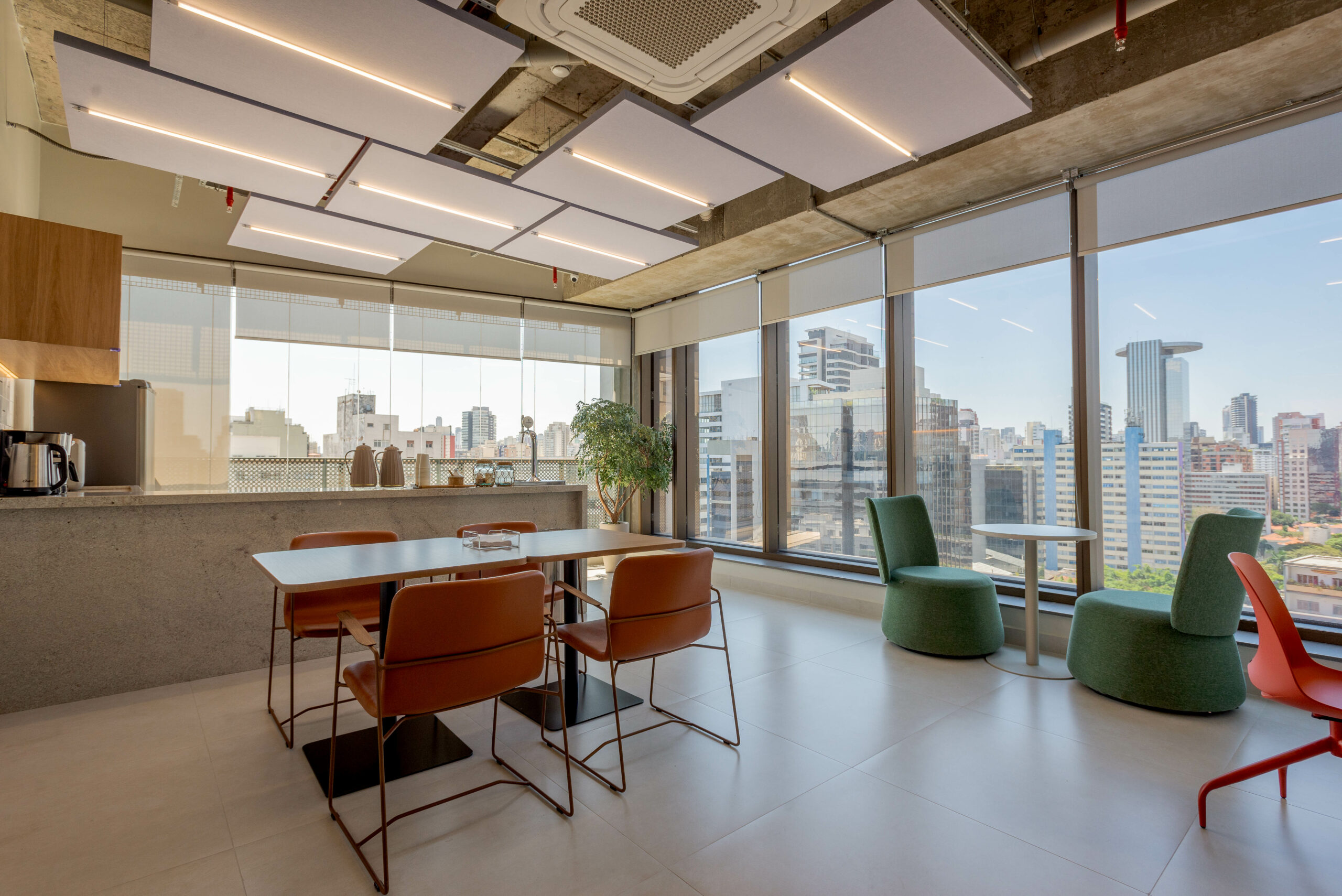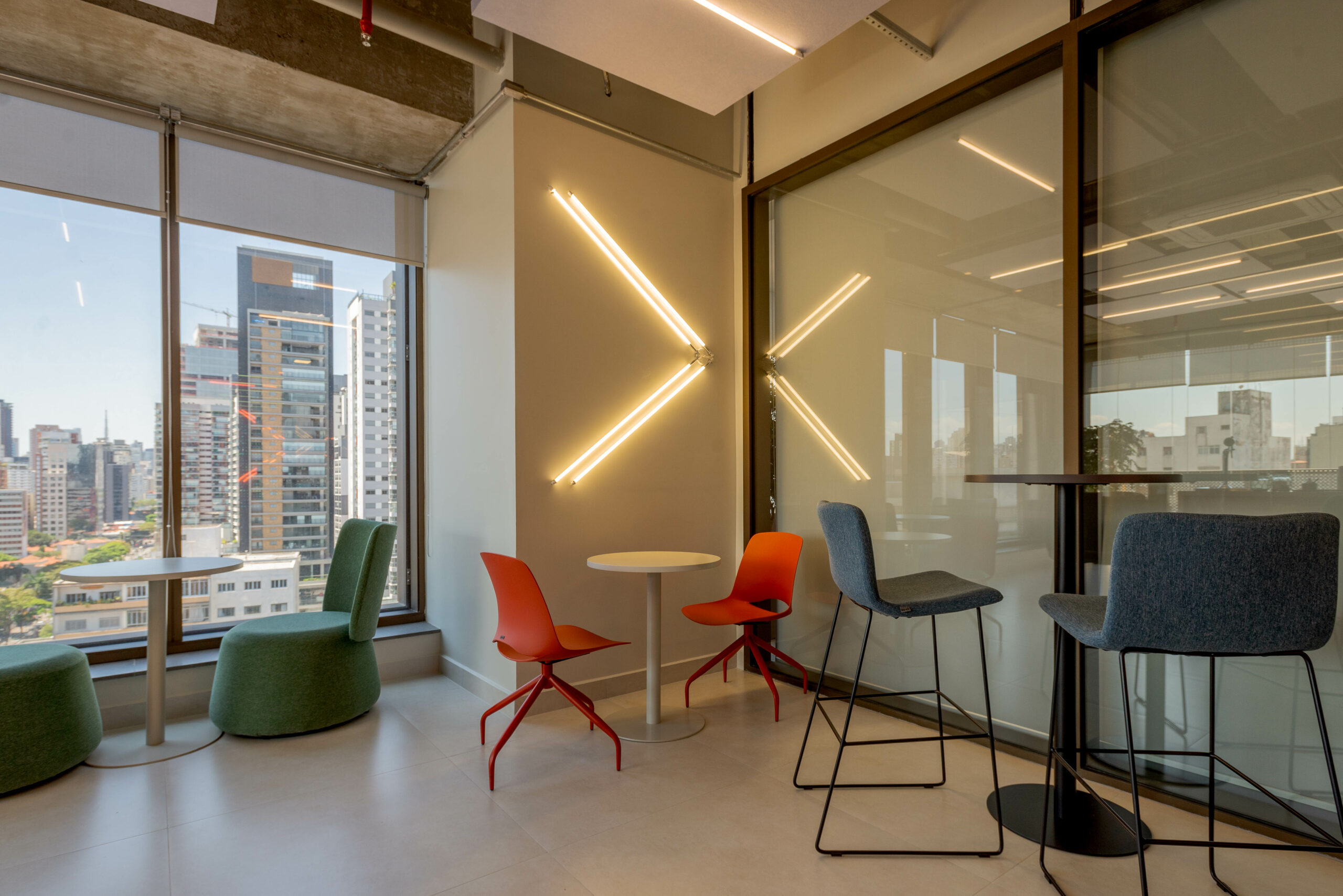 A paleta vibrante, a iluminação e o mobiliário traduzem dinamismo e modernidade, enquanto o layout promove integração e pertencimento.
